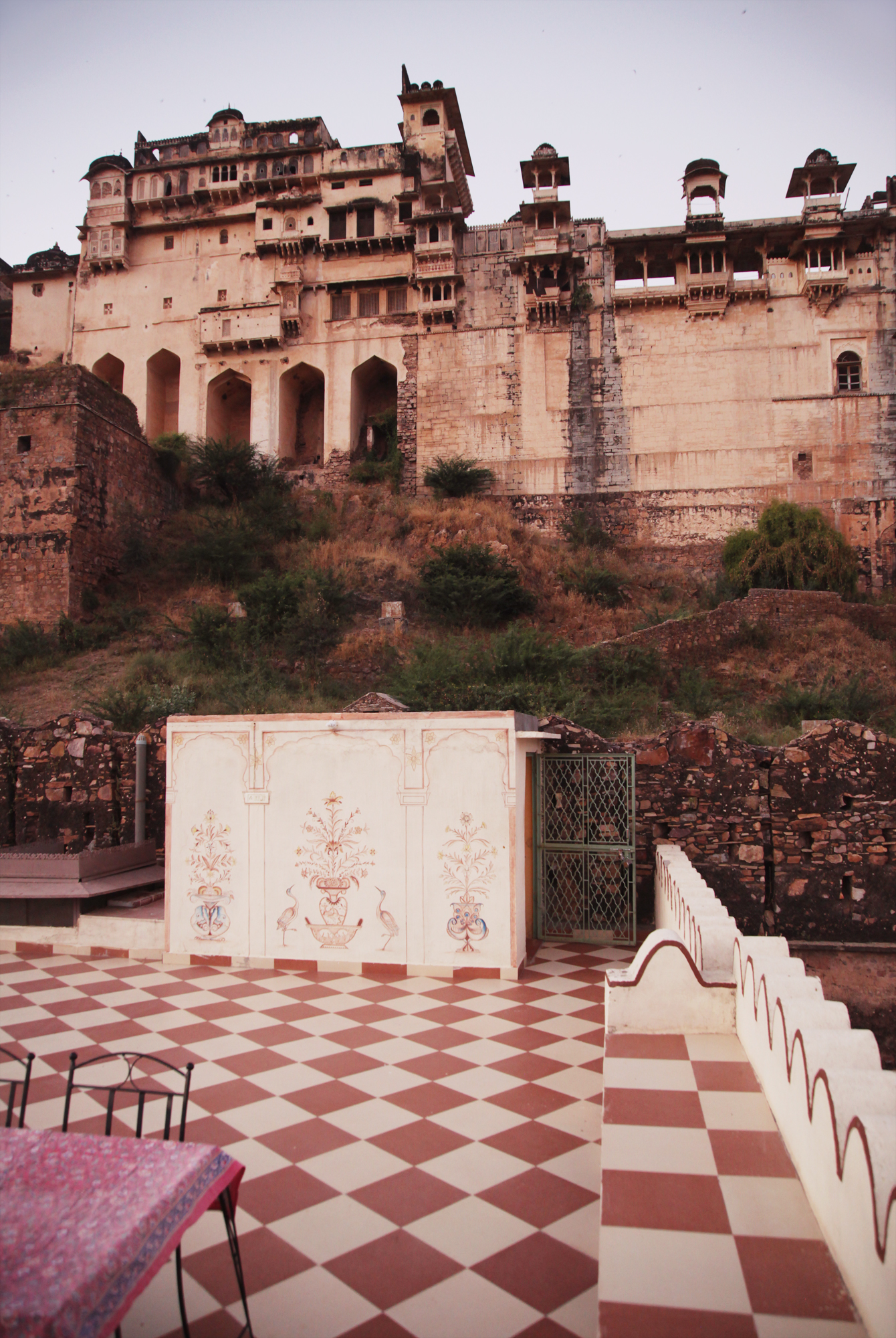 Breakfast and lunch are taken in a sunlit, open room up high, dinner and drinks are served in the evenings on the rooftop terrace in the shadow of colossal Garh Palace above you, with Bundi’s blue rooftops sprawled below.