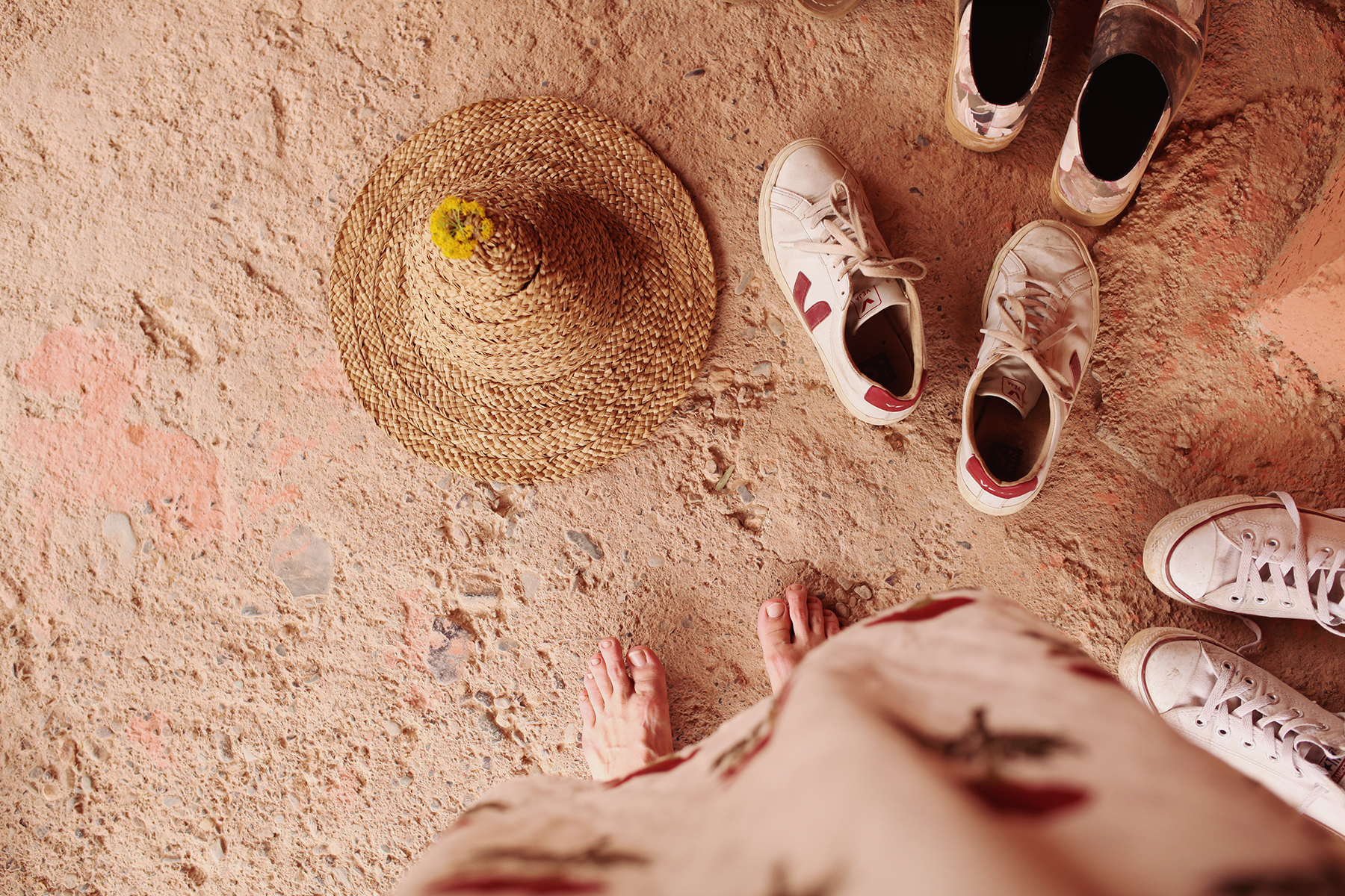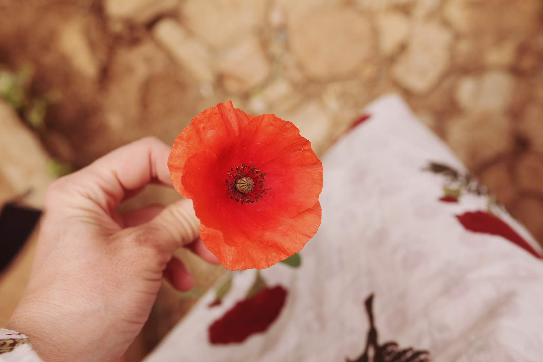 We traipsed through traditional Berber villages on our way up and down the mountains, trying to go unnoticed and failing. The local villagers mostly don’t allow photos of themselves so you’re forced to put down the camera and smile and wave instead, a plus. You pass donkeys and cows and chickens. You pass square houses built into the earth and undulations of the land. We picked wildflowers too on our way, the deep red poppies matching my dress like magic.