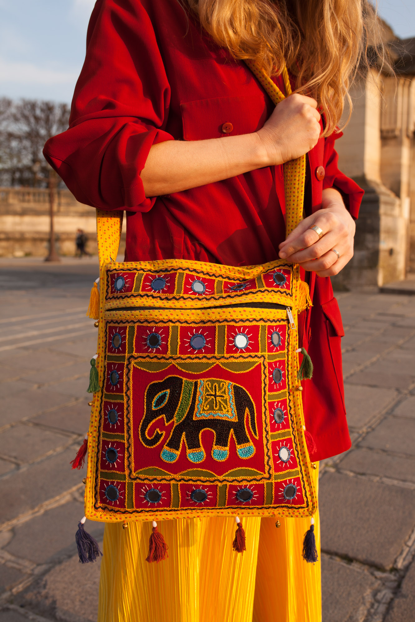 You’ll find brightly coloured, embroidered and bejewelled yoga bags, shoulder bags (mine has become my new everyday laptop/work bag), clutches, bum bags, throw blankets, table coverings and wall hangings in Devifair’s Etsy shop. A few of my favourite pieces in the shop and a little shoot Ula Blocksage and I did on a sunny afternoon in Paris around the Place de la Concorde before I left for India follow…