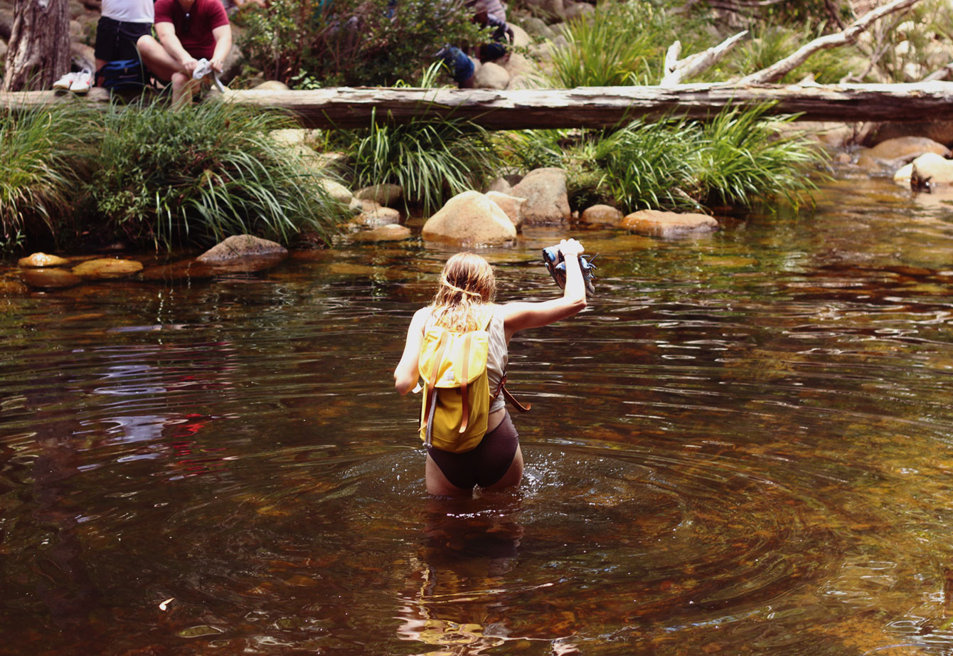 At the end of the trail you'll walk inside a cave. Hoist yourself up through the gap in the rocks overhead and emerge at a gorge with water running through, an oasis in the bush. Strip down, swim and explore the waterfalls and streams.