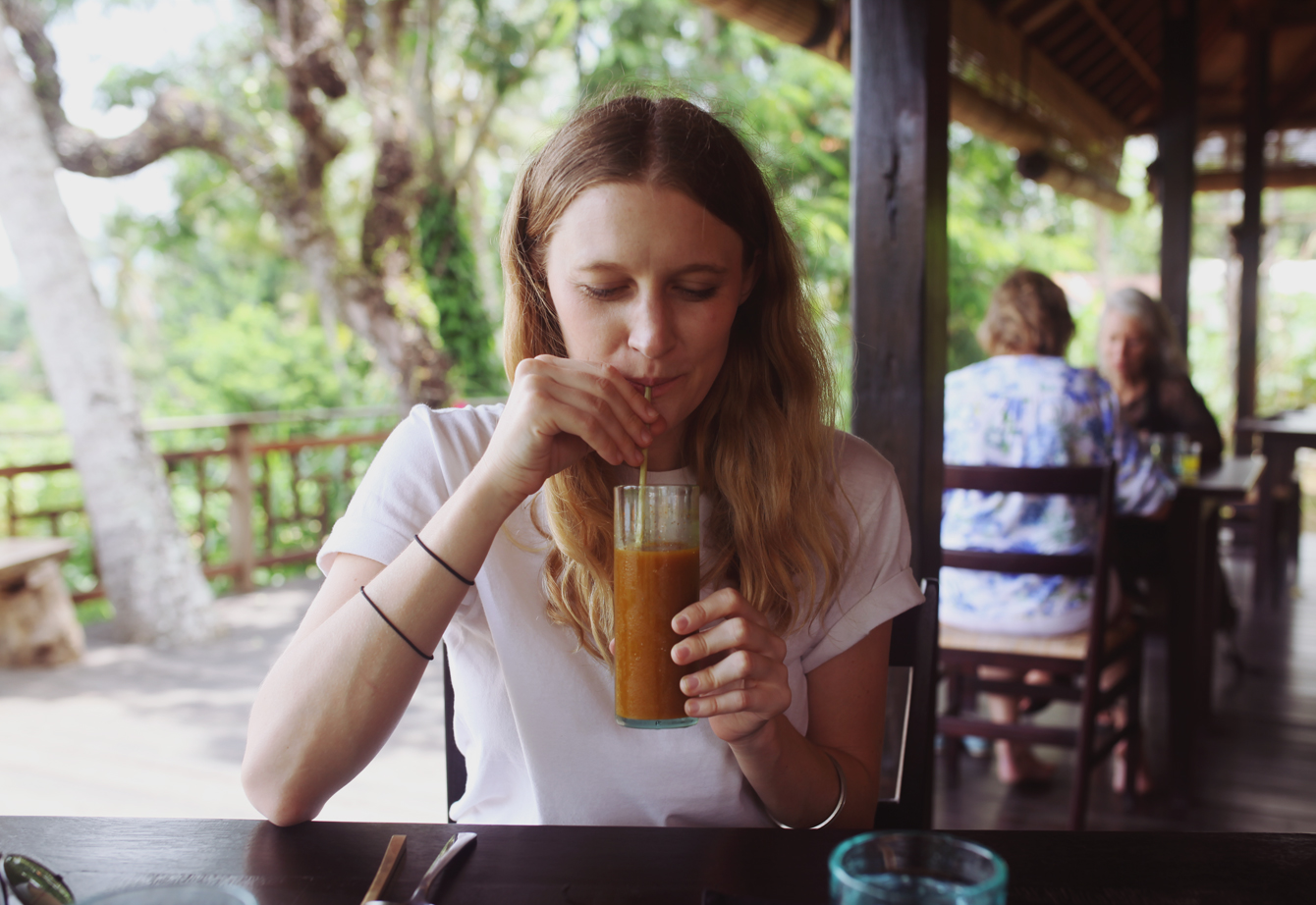 The road to get here is the kind I love to take too, an easy-to-miss turn, off a winding jungle road outside Ubud. It takes you along a skinny path you're sure must be taking you the wrong way, until you arrive at the entry, walk through the foliage and into the quiet, leafy outdoor dining room.